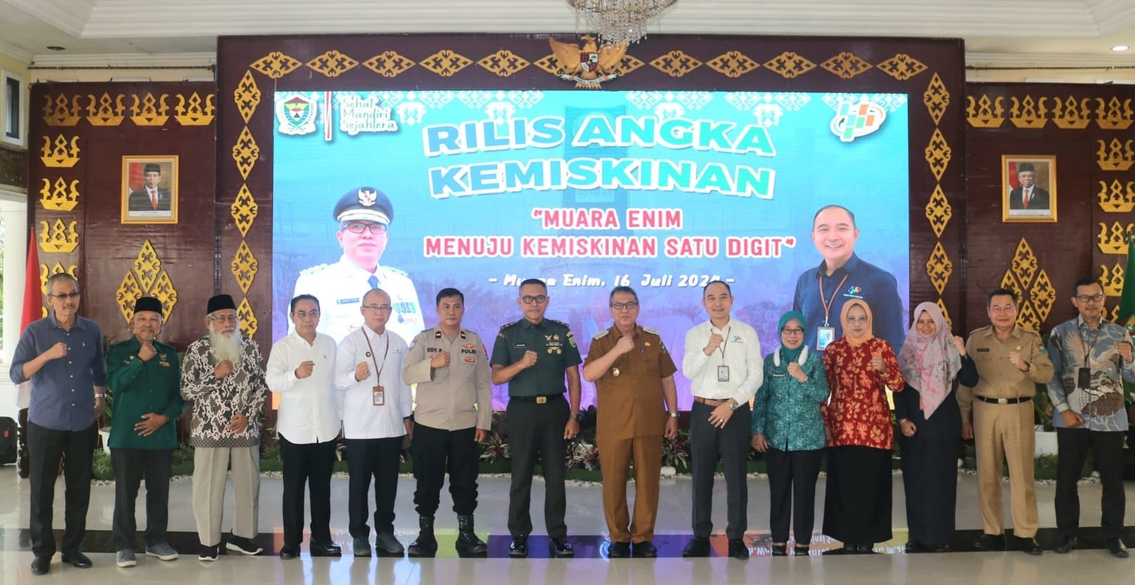 Muara Enim, kilasan.net – Berkat konsistensi Pemerintah Kabupaten Muara Enim dalam menanggulangi kemiskinan di bawah kepemimpinan Pj. Bupati, Dr. H. Ahmad Rizali, M.A., angka kemiskinan Kabupaten Muara Enim pertahun 2024 tembus satu digit atau diangka 9,79 persen. Angka tersebut turun sebesar 1,14 persen dari angka kemiskinan di tahun 2023 sebesar 10,93 persen. Hal ini diungkapkan langsung oleh Kepala Badan Pusat Statistik (BPS) Provinsi Sumatera Selatan Mohammad Wahyu Yulianto, S.Si., SST., M.Si., pada paparan singkatnya tentang Profil Kemiskinan Kabupaten Muara Enim tahun 2024 di Balai Agung Serasan Sekundang, Selasa, (16/07/24).