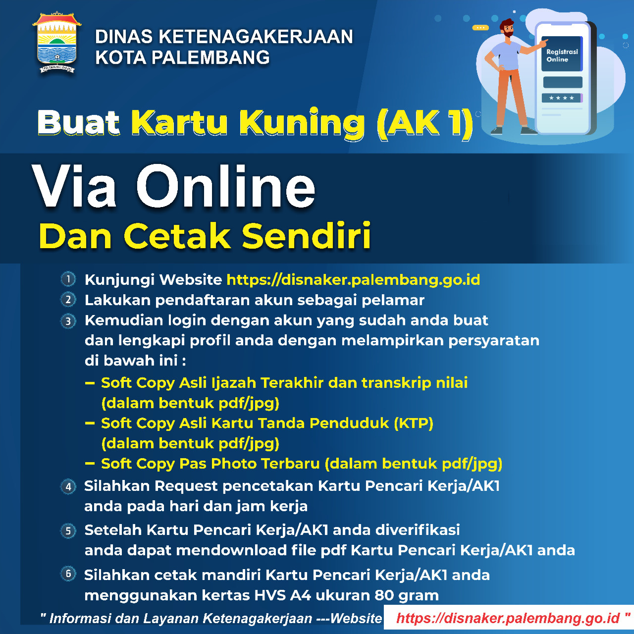 Memanfaatkan teknologi, pencaker kini tidak perlu lagi bertatap muka untuk membuat AK-1 (kartu kuning) sebagai syarat untuk mencari kerja, kini pencaker cukup membuka website: https:// Disnaker.palembang.go.id, bisa mendaftarkan secara online dan mencetak sendiri dirumah.
