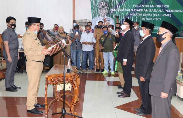Muara Enim, kilasan.net-Plt. Bupati Muara Enim H. Juarsah, S.H., Haji Juarsah disaksikan oleh Ketua DPRD Kabupaten Muara Enim yang diwakili oleh Munyati, S.H., M.H., dan Ketua Badan Pengawas Daerah, Ir. H. Abdul Nadjib, M.M., Selasa pagi (25/08) melantik direksi baru Perusahaan Daerah Sarana Pembangunan Muara Enim (PDSPME) di Ruang Rapat Pangripta Nusantara, Kantor Bappeda Muara Enim. Adapun para pejabat baru Perusda yang dilantik yaitu Novriansah Regan sebagai Direktur Utama; Alfonsus Sujono Purba sebagai Direktur Utama Bisnis dan Produksi; kemudian H. Bambang Widodo sebagai Direktur Umum dan Keuangan.
